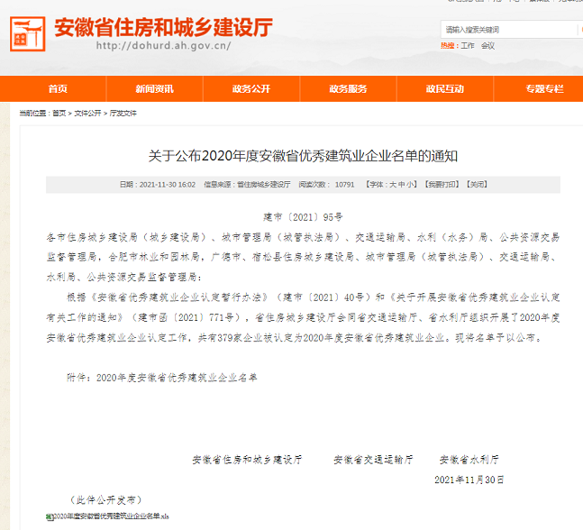 據(jù)悉,本次評(píng)優(yōu)是由安徽省住房和城鄉(xiāng)建設(shè)廳、省交通運(yùn)輸廳、省水利廳首次聯(lián)合開(kāi)展的全省優(yōu)秀建筑業(yè)企業(yè)認(rèn)定評(píng)選活動(dòng),安徽省優(yōu)秀建筑業(yè)企業(yè)稱號(hào)是對(duì)我省建筑業(yè)企業(yè)綜合實(shí)力的認(rèn)定。