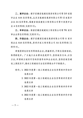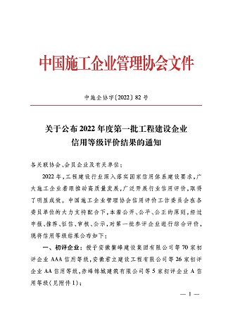 2022年,黃山市建工集團股份有限公司再次榮獲施工企業(yè)最高信用評級“AAA級企業(yè)信用證書”。這是對黃山市建工集團股份有限公司持續(xù)積累的經營管理能力、合同履約能力、市場競爭能力及優(yōu)質社會形象的權威認證。
